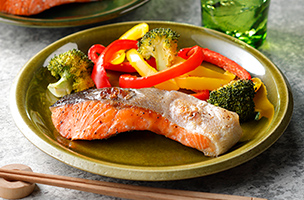 液晶画面から肉・魚の種類や形状を選択。分量にあわせて火加減がオートで調節されるため、焼き上がりもおまかせで。付け合わせの野菜も一緒に調理可能です。基本の味付けは塩・こしょうでOK。事前に下味をつけて焼き上げたり、ソースを作ってアレンジしたりなど、お好みの味をお楽しみいただけます。
