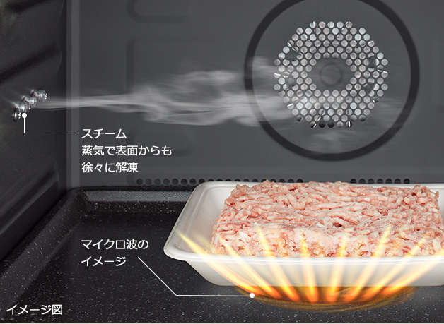 重さと温度をはかり*3、必要な加熱量を算出し、分量にあわせて出力を変えて加熱します。肉・魚の種類や形状にあわせて加熱を制御し、レンジだけではムラができやすいため、スチームを組みあわせて表面からも徐々に解凍し、ムラを抑え*2ます。