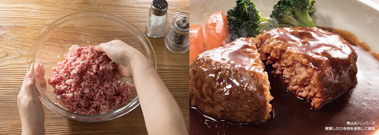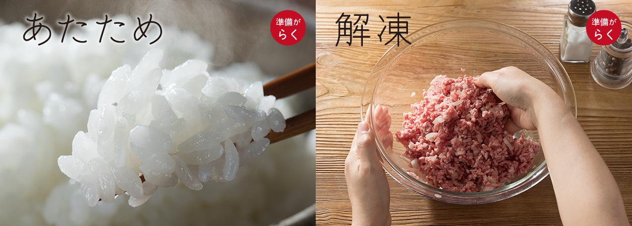 *2 食品の形状・庫内温度・容器等により仕上がりが異なります。薄切り肉など8種類の食品に対し解凍を行い、各々9点を温度測定。測定温度が一定差以内にあることを確認。