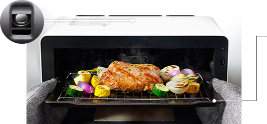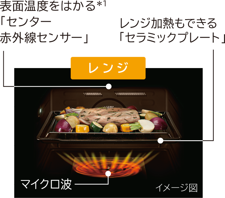 センターに設置された赤外線センサーが食品の表面温度をはかり*1、分量を推定。冷凍も見極めて、解凍から焼き上げまでをオートで調理。