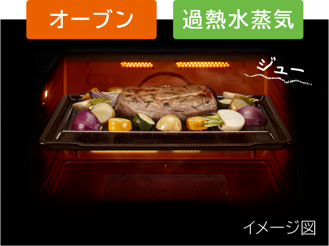 過熱水蒸気とオーブンの熱風でお肉を包み込むように焼き、旨みを閉じ込める。