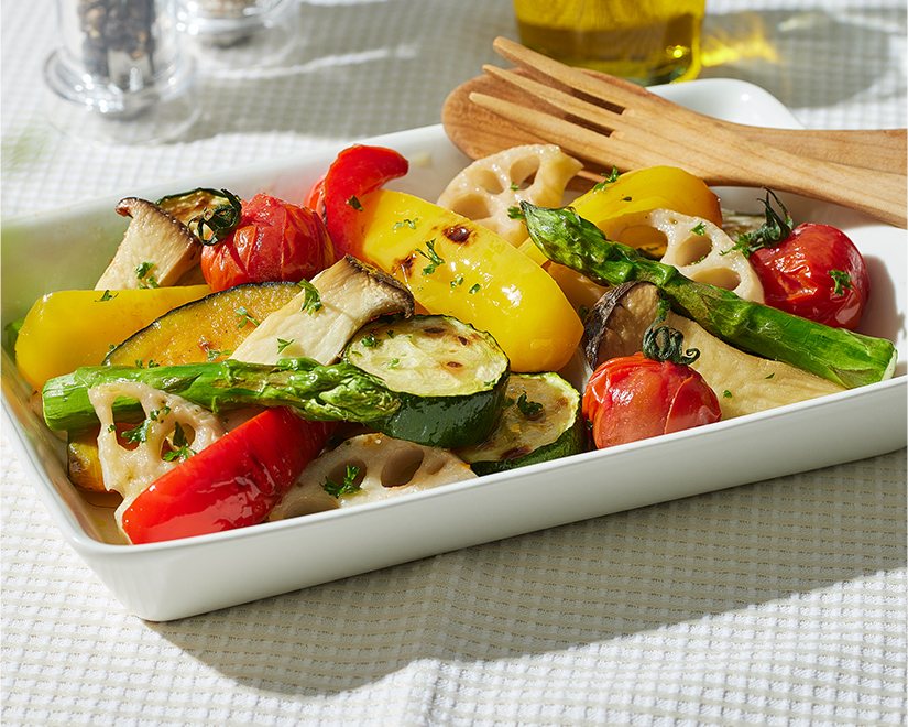 レンジ加熱で食材の中から加熱することで、厚みのある根菜もすばやく加熱します。