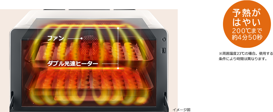 予熱がはやく、オーブン調理も気軽に。200℃まで約4分50秒。