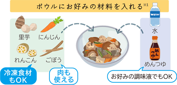 お好みの食材をボウルに入れてスタート。冷凍・冷蔵・常温の食材をまとめておまかせで調理できます。