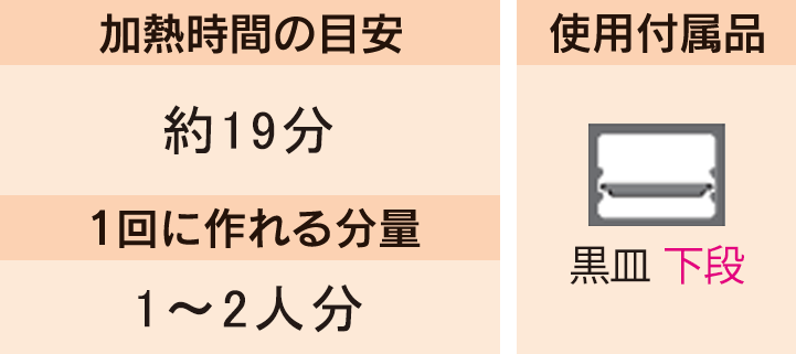 | 2 | 牛乳を加えて加熱レンジ600W | 1〜2分 | 1分30秒~3分 | 2〜4分 | 3〜6分 | |