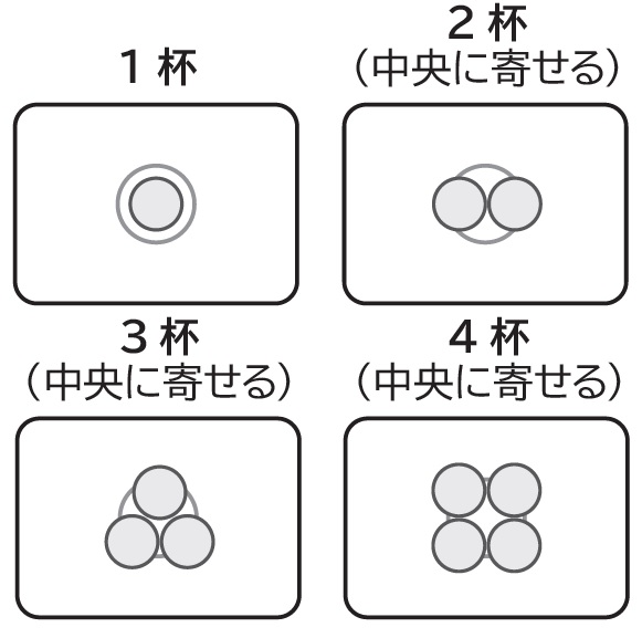 • 牛乳、豆乳、お茶、コーヒー、水はあたため飲み物・牛乳(杯数)であたためます。