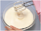 4. 卵黄を加えてさらに泡立てる。楊枝の先端から1/4を生地に刺してすぐに倒れなければ泡立ては十分。バニラエッセンスを加え、低速で混ぜる。