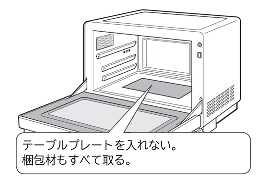 - テーブルプレートを取り外し、加熱室を空の状態にしてドアを閉める