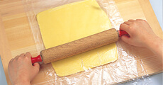 4. 生地をラップの間に挟み、めん棒で5mmの厚さにのばす。