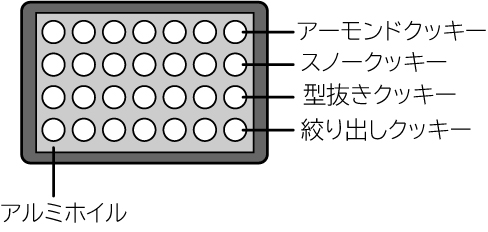 1. それぞれのクッキーの材料・作りかたを参照して生地を作り、図のようにアルミホイルを敷いた角皿に並べる。