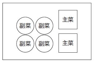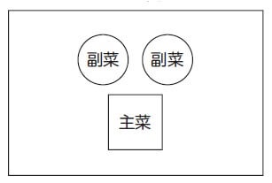 2. *主菜*1品と、*副菜*2品を選び、トーストセットの並べかたを参照して角皿に並べる。