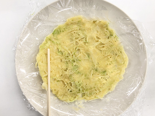 1. 千切りにしたキャベツを耐熱皿に広げてラップをかけてレンジ500W約3分加熱
