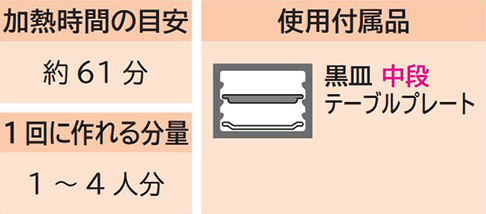 1. 黒皿にさつまいもを並べて、中段に入れ和食 焼き物・揚げ物190 焼きいもで加熱する。
