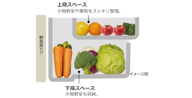 さまざまな野菜や果物に対応できる、整理しやすい2段ケースの野菜室です。
