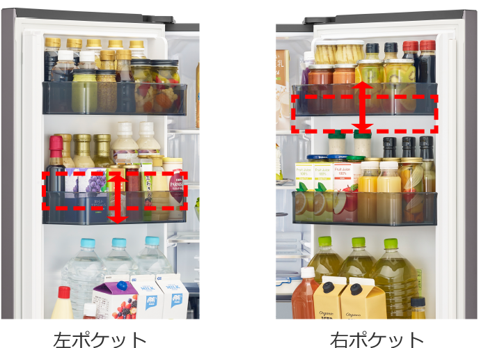 左右のドアポケット(下段)には、2Lペットボトルが合計6本収納、さらに1L牛乳パックが合計6本同時に収納できます。