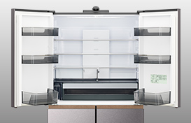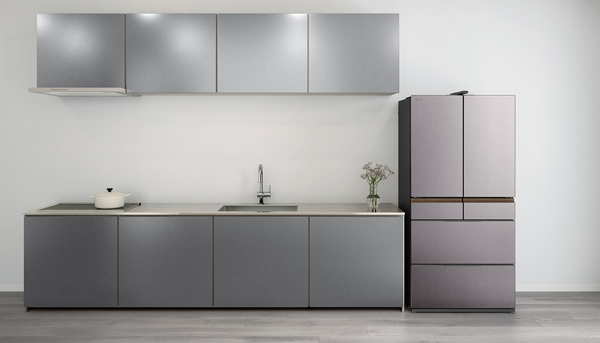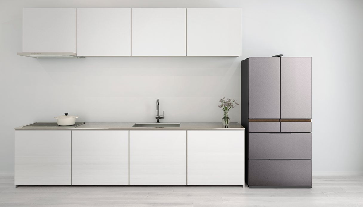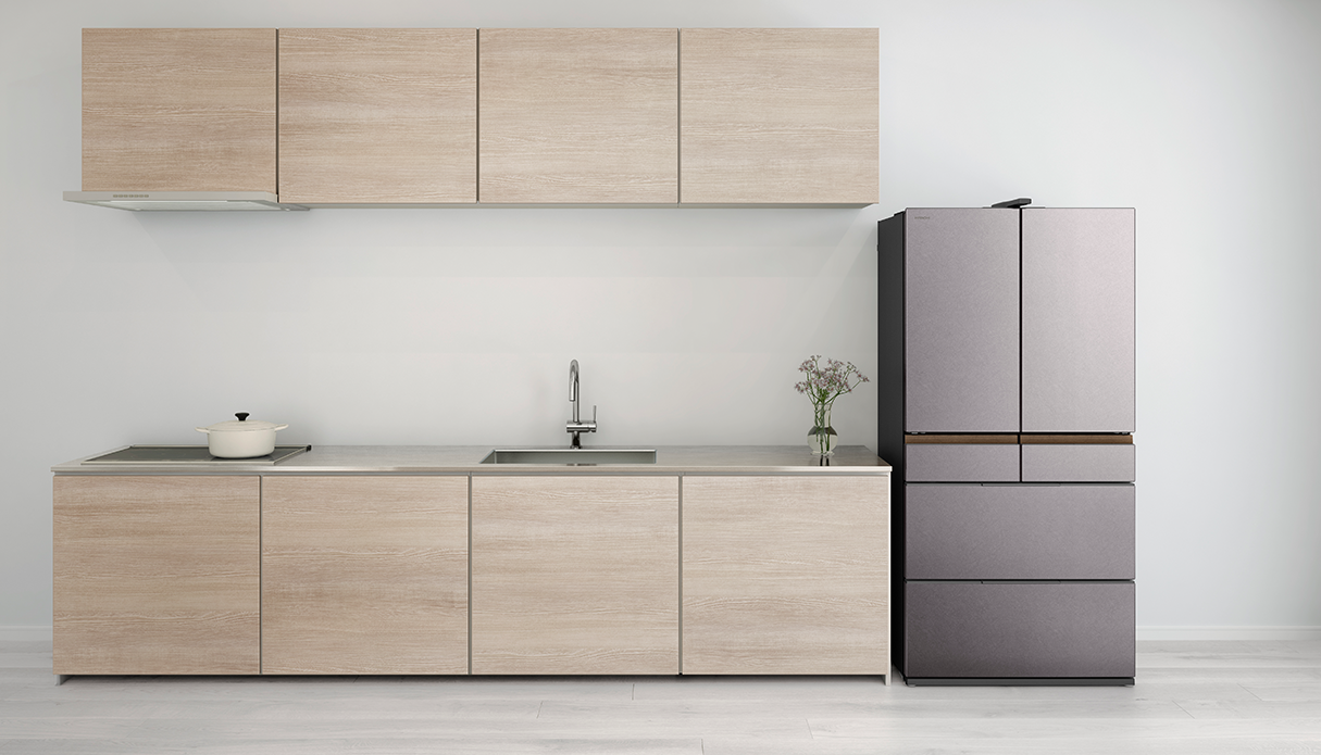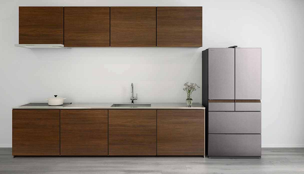 冷蔵室棚の端部や特鮮氷温ルームハンドルにヘアライン調のステンレスを採用し、水平方向のラインを強調したシンプルかつ洗練されたデザインを実現。ドアポケットや特鮮氷温ルーム、引き出しのケースなどにダークトーンを設けることで重厚感を表現しました。