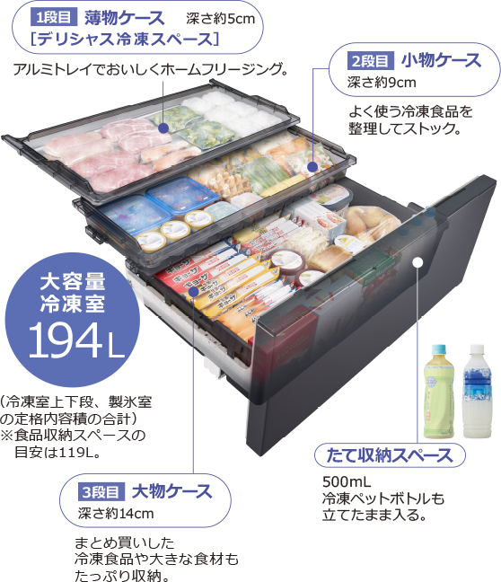 1段目の棚には、500mLペットボトルやドレッシングなどの容器を立てたまま収納可能。ドアポケットと使い分けてボトル類をたっぷり収納、整理整頓ができます。