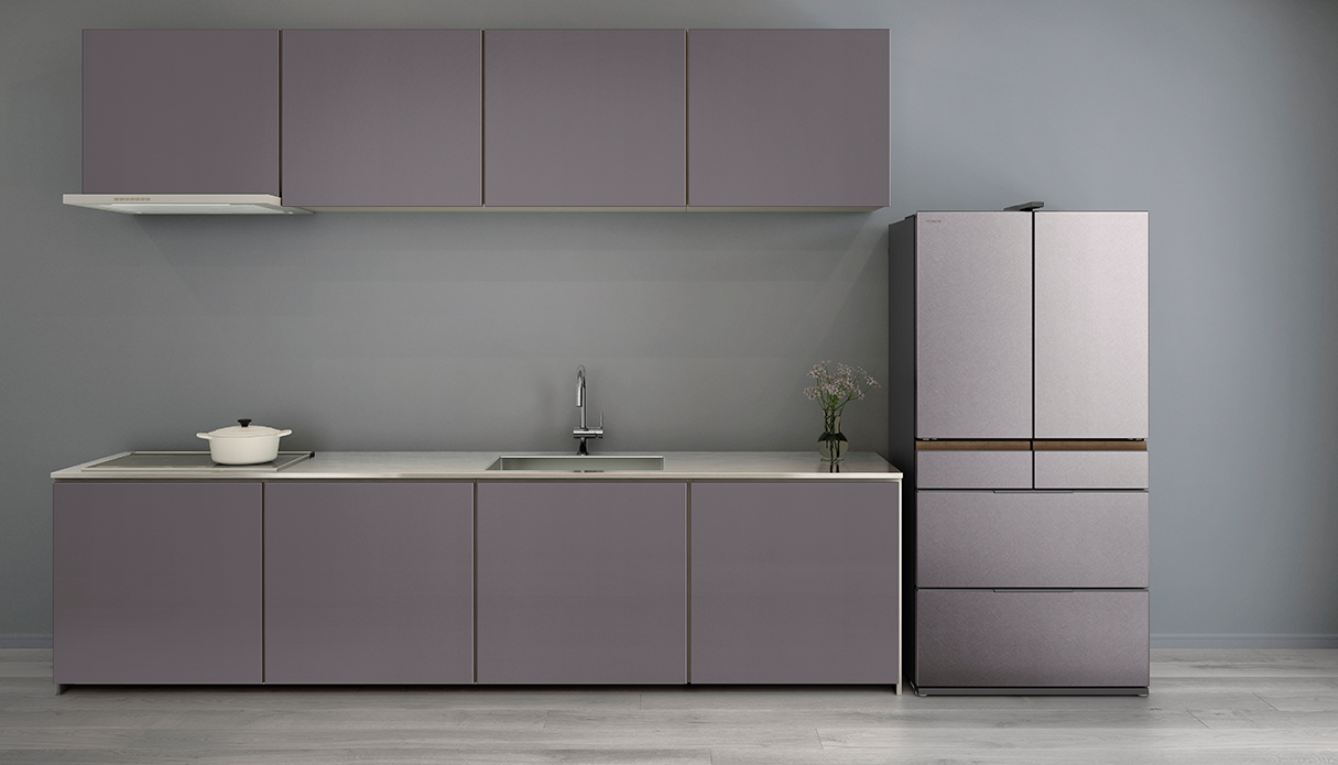 冷蔵室棚の端部や特鮮氷温ルームハンドルにヘアライン調のステンレスを採用し、水平方向のラインを強調したシンプルかつ洗練されたデザインを実現。ドアポケットや特鮮氷温ルーム、引き出しのケースなどにダークトーンを設けることで重厚感を表現しました。