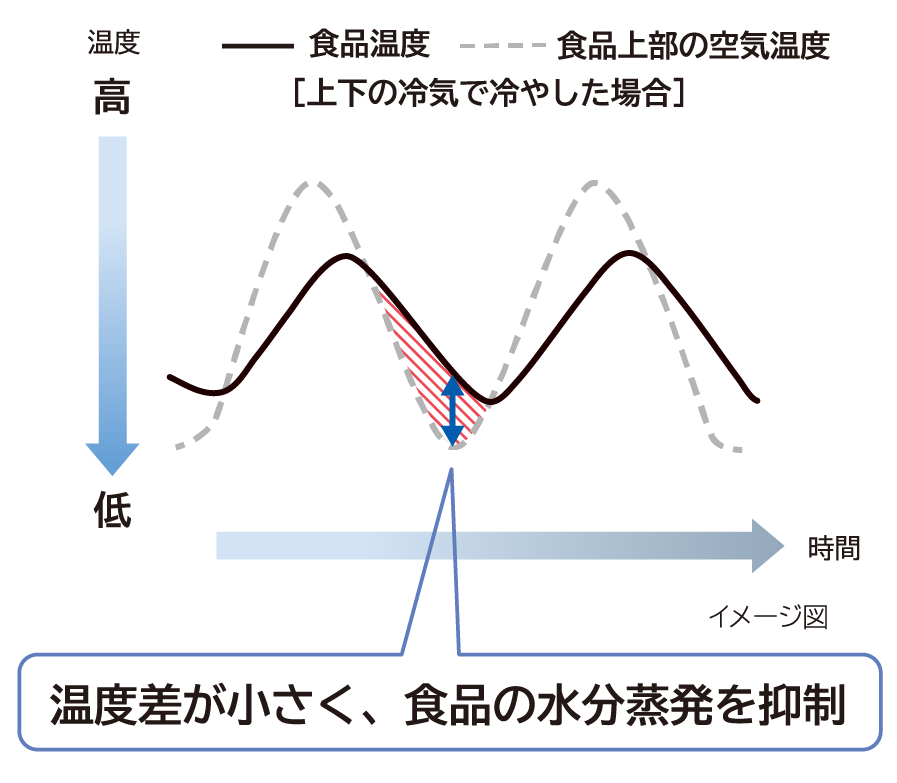 冷気で上下から食品を包み込むように冷やし、食品と周りの空気の温度差を抑えることで、霜つきを抑制。