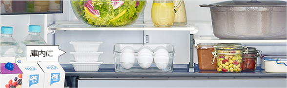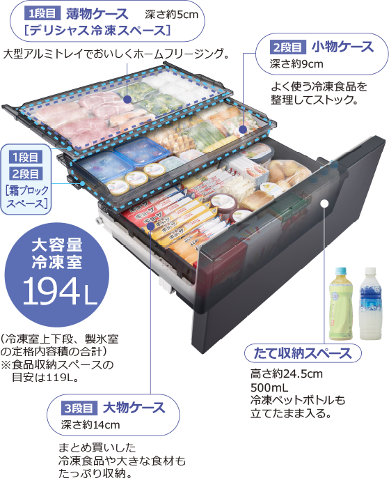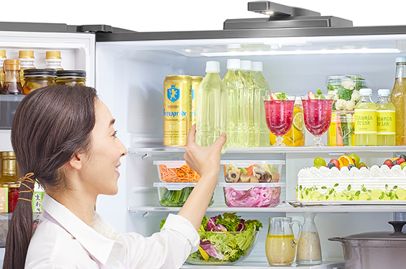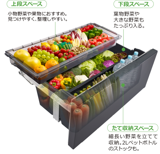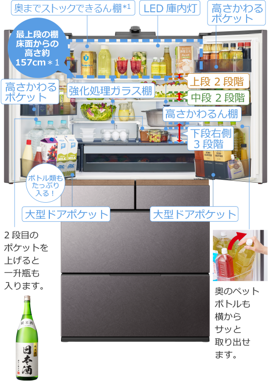 1段目の棚には、500mLペットボトルやドレッシングなどの容器を立てたまま収納可能。ドアポケットと使い分けてボトル類をたっぷり収納、整理整頓ができます。