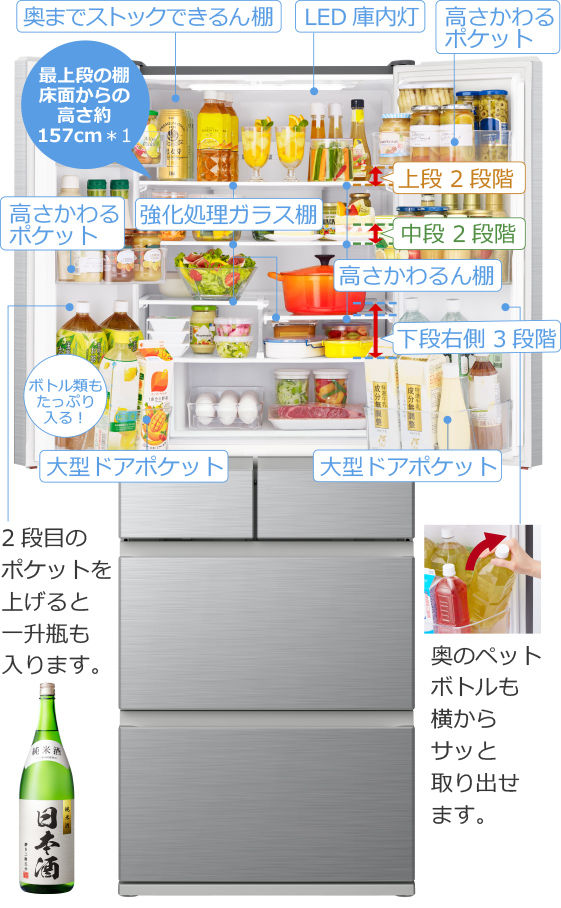 1段目の棚には、500mLペットボトルやドレッシングなどの容器を立てたまま収納可能。ドアポケットと使い分けてボトル類をたっぷり収納、整理整頓ができます。