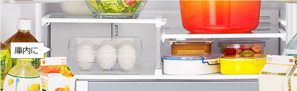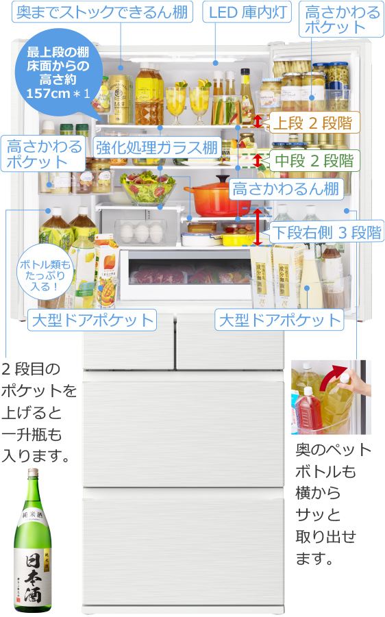 1段目の棚には、500mLペットボトルやドレッシングなどの容器を立てたまま収納可能。ドアポケットと使い分けてボトル類をたっぷり収納、整理整頓ができます。