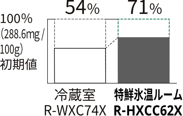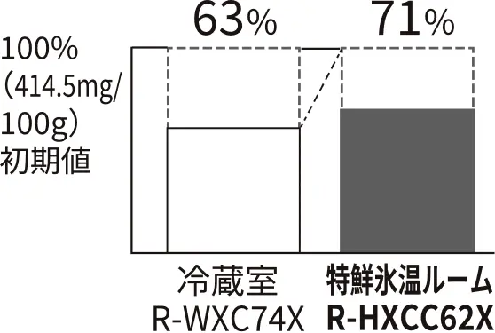 *4 2025年度商品R-HXCC62Xの特鮮氷温ルーム(ラップなし)と2025年度商品R-WXC74Xの冷蔵室(「スポット冷蔵」オフ、ラップあり)との比較。室温約20℃、ドア開閉なし。7日間または3日間保存後のイノシン酸(うまみ成分)の残存率で見ています。