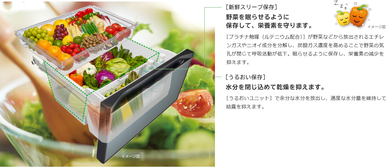 野菜は収穫後も生きていて、冷蔵庫内でも呼吸をし、エネルギーを消耗し続けます。これが鮮度を落とす主な原因の一つです。新鮮スリープ野菜室なら炭酸ガスの効果で野菜の呼吸活動を抑え、眠らせるように保存して、鮮度を守ります。