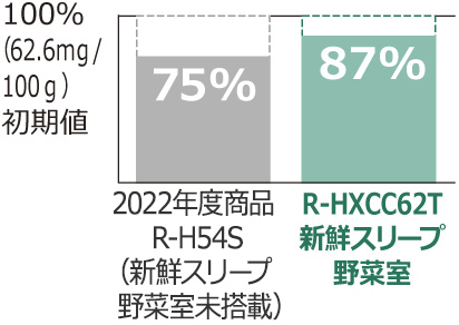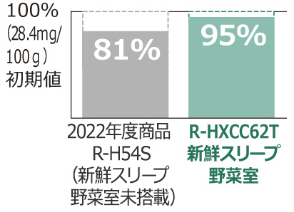*2 R-HXCC62T新鮮スリープ野菜室(下段スペース)と2022年度商品R-H54S(新鮮スリープ野菜室未搭載)との比較。初期値に対して栄養素等を増やす効果はありません。