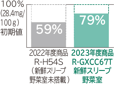 *2 2023年度商品R-GXCC67T 新鮮スリープ野菜室(下段スペース)と2022年度商品R-H54S(新鮮スリープ野菜室未搭載)との比較。初期値に対して栄養素を増やす効果はありません。