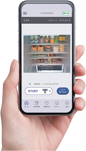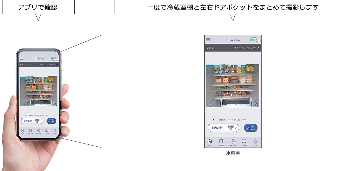 冷蔵室、冷凍室下段、野菜室を開けるとカメラが室内を自動で撮影。いつでもスマホで確認できるから、買い忘れや二重購入、買いすぎが減らせて常備しておきたい食品や野菜の確認もできます。