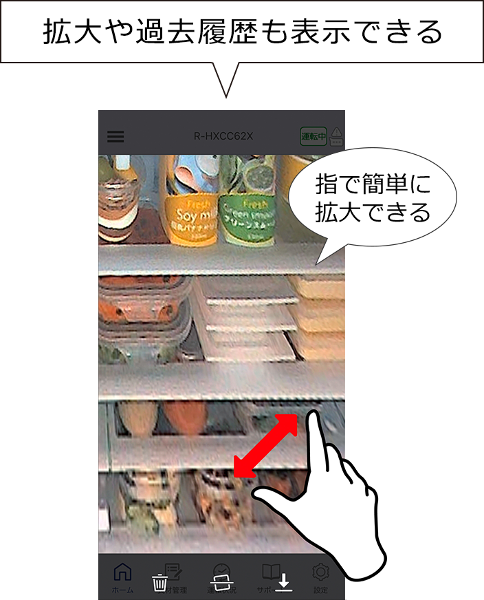 ※「冷蔵庫カメラ」の利用には、冷蔵庫本体の近くで、「日立冷蔵庫コンシェルジュアプリ」を使用して、スマートフォンと冷蔵庫本体との連携が必要です。出荷時、アプリはオフ設定です。オンにしたときは消費電力量が約3%増加します。