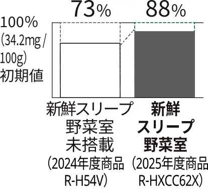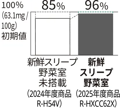 *2 2025年度商品R-HXCC62X 新鮮スリープ野菜室(下段スペース)と2024年度商品R-H54V(新鮮スリープ野菜室未搭載)との比較。初期値に対して栄養素を増やす効果はありません。