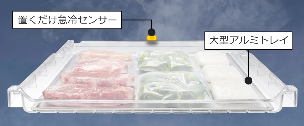 アルミトレイが食品の熱を奪ってすばやく冷凍。水分が凍る最大氷結晶生成帯をすばやく通過することで、氷結晶の成長を抑え、食品の細胞の破壊を抑えます。