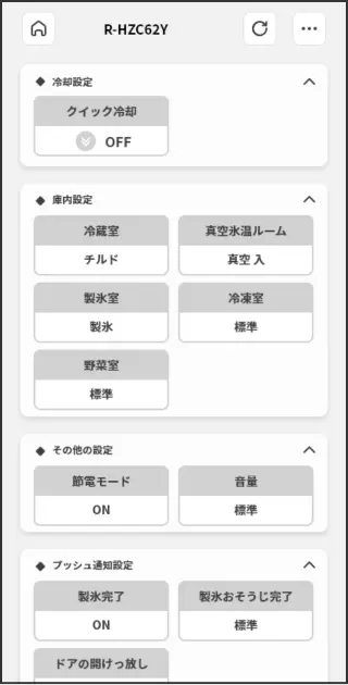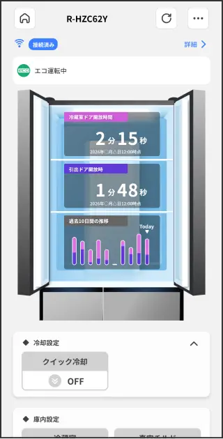 外出先からもすぐに運転状況*1の確認ができます。また、冷蔵庫の設定状況を一覧で確認することができ、変更も簡単にできます。