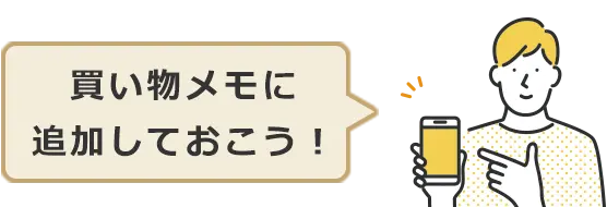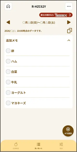 買い忘れしたくない食材は、簡単に買い物メモに追加できます。買い物メモは、「ぱっとレシピけいかく」と連携しています。