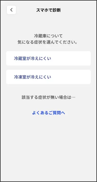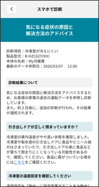 ご使用中のコネクテッド家電(冷蔵庫・洗濯機)の「気になる症状」をスマホから手軽に診断します。お客さまの運転データを使った診断により、自分で解決できるヒントやアドバイスを入手できます。