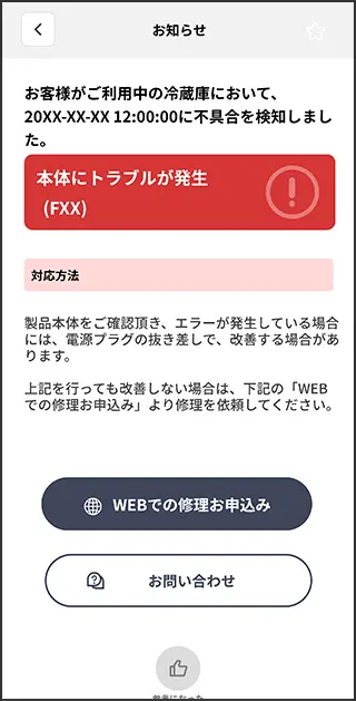 製品本体で不具合※が発生した場合に、発生通知から修理のお申し込みまでワンストップでサポートします。