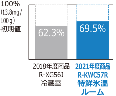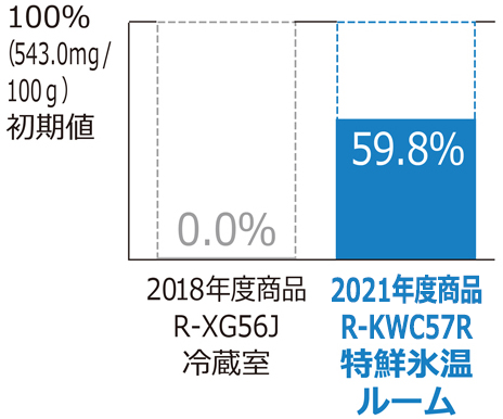 *2 2021年度商品 R-KWC57Rの特鮮氷温ルーム(ラップなし)と2018年度商品R-XG56Jの冷蔵室(ラップあり)との比較。室温約20℃、ドア開閉なし。7日間または3日間保存後のイノシン酸(うまみ成分)の残存率で見ています。