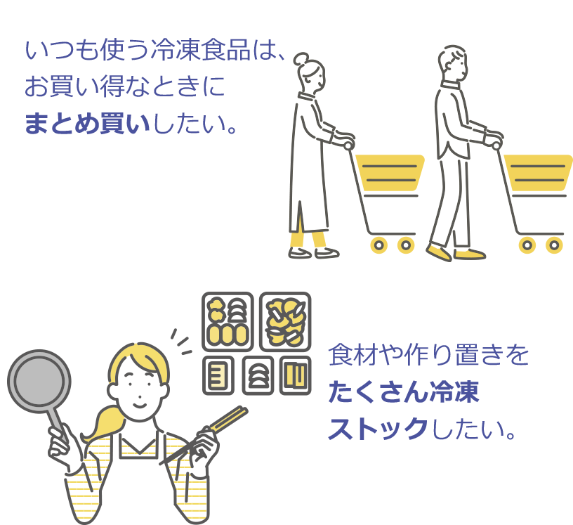 栄養バランスを考えつつ、旬の新鮮野菜をたっぷりと味わいたい。だから、出し入れしやすい上段を野菜が保存できる設定に変更。使いきれなかった食材は作り置きにして冷凍。