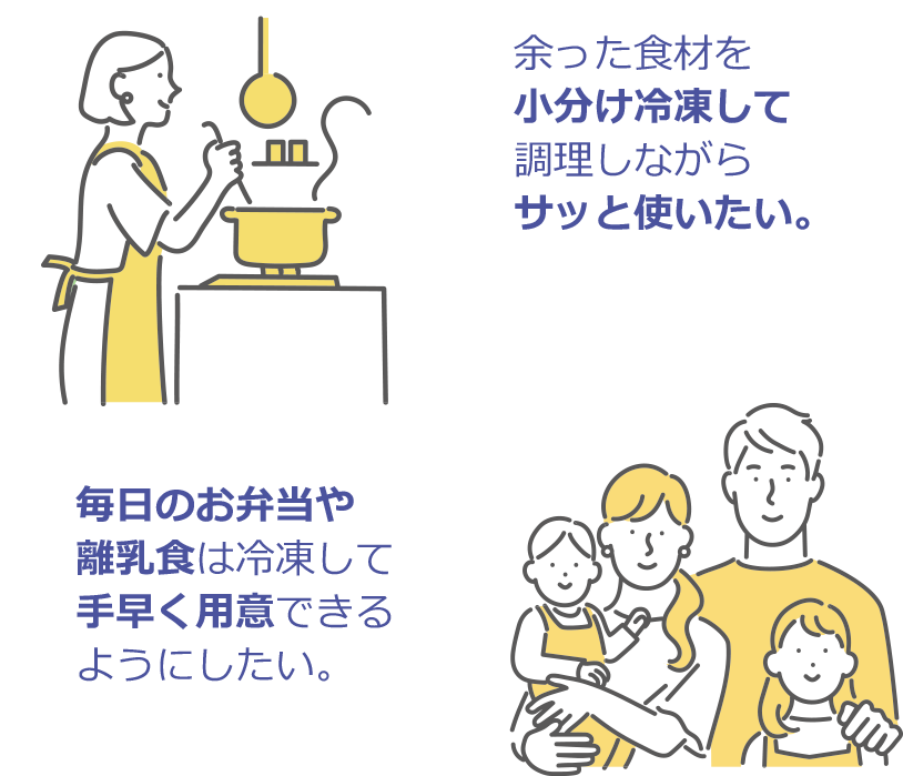 子ども中心の生活に。家事や育児に忙しい毎日のなか、離乳食をその都度作るのは結構たいへん。だから、まとめて作って取り出しやすい上段にかしこく冷凍保存。