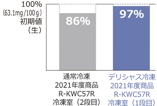 ※1 当社調べ。室温約20℃、牛肉150g3枚を冷凍した場合。最大氷結晶生成帯(-1℃から-5℃)を通過する時間:2021年度商品 R-KWC57R デリシャス冷凍約110分、2021年度商品 R-KWC57R 冷凍室(2段目)通常冷凍約194分。食材の種類・状態・量によって効果が異なります。