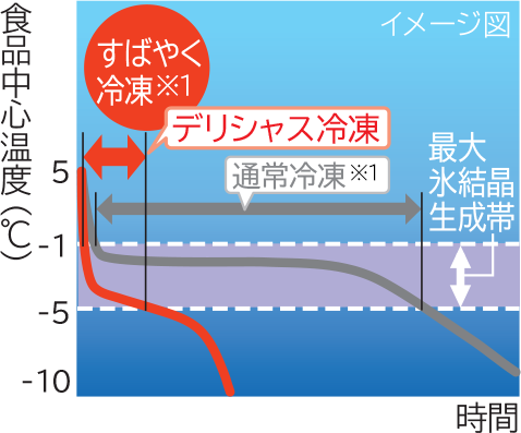 すばやく冷凍することで氷結晶の成長を抑えて、解凍時のドリップの流出を少なくします。