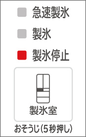 ※製氷皿や水の通り道を水洗いする製氷おそうじ機能があるため、製氷皿は取り外しができません。 ※2 上段切替室:冷凍、下段切替室:冷蔵設定時。室温30℃、ドア開閉なしでの1回(12個)の製氷時間。製氷能力はドア開閉状況や室温などで変わります。1日に1回(約7時間)急速製氷した場合、通常製氷時に比べて消費電力量は増加します。当社試験条件による。7時間経過した後は、自動で通常製氷に移行します。 ※3 硬度100mg/L以下のものをご使用ください。ミネラルウォーターを使用すると氷に白い浮遊物が混じることがありますが、これはミネラル分が氷に含まれたもので飲用しても影響はありません。