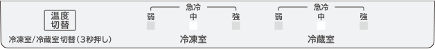 ※出荷時は冷蔵室、冷凍室共に「中」に設定されています。「急冷」設定時は「弱」と「強」のLEDが点灯します。