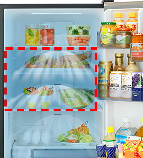 冷気を直接あてない間接冷却で、野菜の乾燥を抑えながら保存します。[間接冷却カバー]で、野菜から出る水分を野菜室内に閉じ込めます。