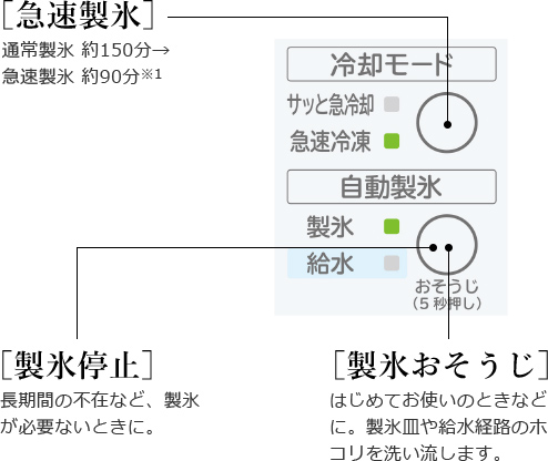 ※1 室温約30℃、ドア開閉なしでの1回(10個)の製氷時間。製氷能力はドア開閉状況や室温などで変わります。急速製氷を行うときは、「急速冷凍」に設定します。急速冷凍設定時は、消費電力量が増加します。