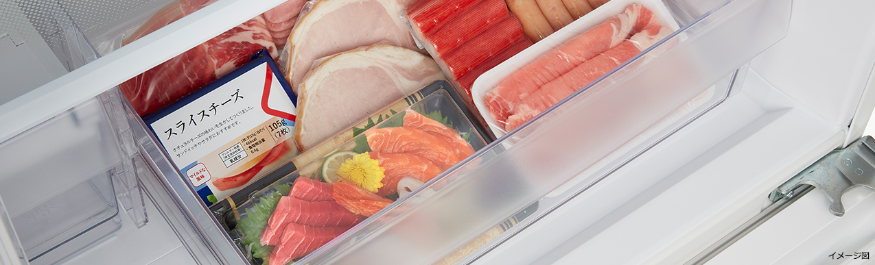 *1 2020年度商品R-V38NVにて実験実施。R-V38NVとR-V38TVは同等性能です。R-V38NVのうるおいチルド(ラップなし)で保存。 室温約20℃、ドア開閉なし。3日間保存後の水分残存率とK値で見ています。スライスチーズの水分残存率:約75.1%。マグロのK値:3日後18.8%(初期値6.4%)。K値とは生鮮度を表す指標の一つで値が低いほど鮮度がよいことを示します。一般に、60%以上では食用に適さないとされており、20%以上では生食に適さないとされています。