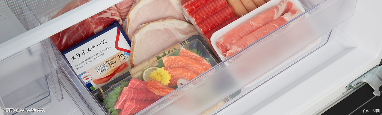 *1 2020年度商品R-V38NVにて実験実施。R-V38NVとR-V38Vは同等性能です。R-V38NVのうるおいチルド(ラップなし)で保存。 室温約20℃、ドア開閉なし。3日間保存後の水分残存率とK値で見ています。スライスチーズの水分残存率:約75.1%。マグロのK値:3日後18.8%(初期値6.4%)。K値とは生鮮度を表す指標の一つで値が低いほど鮮度がよいことを示します。一般に、60%以上では食用に適さないとされており、20%以上では生食に適さないとされています。