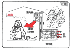 冷房のときは部屋の熱を外に送り、暖房のときは外の熱を部屋に送ります。